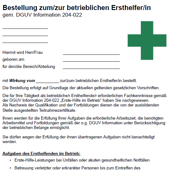 Mit dieser kostenlosen Vorlage können Sie die Bestellung von Ersthelferinnen und Ersthelfern im Betrieb einfach und rechtssicher dokumentieren. Sie berücksichtigt die geltenden gesetzlichen Vorgaben und enthält wichtige Hinweise zu Aufgaben, Qualifikation und rechtlichem Schutz. Jetzt herunterladen und direkt einsetzen!
