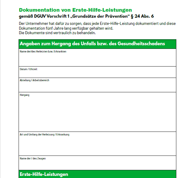 In unserem Downloadbereich stellen wir Ihnen kostenfrei nützliche Vorlagen als PDF zur Verfügung – z. B. zur Dokumentation von Erste-Hilfe-Leistungen im Betrieb.
