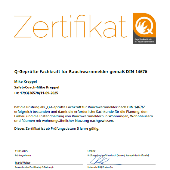 Ob im Unternehmen oder zuhause – Sicherheit lebt davon, dass alles gut ineinandergreift. Genau deshalb bieten wir Ihnen bei SafetyCoach-Mike Kreppel™ alle Leistungen aus einer Hand: von der Arbeitssicherheit und dem Brandschutz über das Prüfen von Leitern & Tritten bis hin zum Erstellen von Flucht- & Rettungsplänen und natürlich auch die Rundum-Betreuung Ihrer Rauchwarnmelder und vielem mehr.